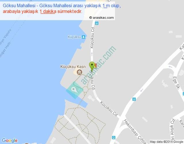 Göksu Mahallesi - Göksu Mahallesi arası yaklaşık olarak 90 km/h ile yukarıda belirtilen sürede olup, iki yerin kuş uçuşu uzaklığı (mesafesi) 0'dir. Yolculuk otobüsle 1 dakika sürmektedir.