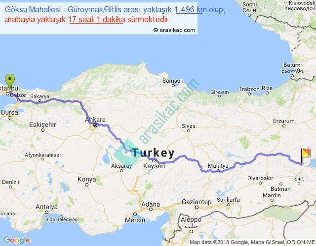 Göksu Mahallesi - Güroymak Bitlis arası yaklaşık olarak 90 km/h ile yukarıda belirtilen sürede olup, iki yerin kuş uçuşu uzaklığı (mesafesi) 1137'dir. Eğer belirtilen yerler arasında uçak seferi var ise bu süre uçakla 1 saat 44 dakika'ya kadar düşebilir. Yolculuk otobüsle 22 saat 7 dakika sürmektedir.