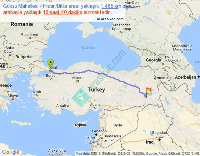 Göksu Mahallesi - Hizan Bitlis arası yaklaşık olarak 90 km/h ile yukarıda belirtilen sürede olup, iki yerin kuş uçuşu uzaklığı (mesafesi) 1188'dir. Eğer belirtilen yerler arasında uçak seferi var ise bu süre uçakla 1 saat 49 dakika'ya kadar düşebilir. Yolculuk otobüsle 1 gün 0 saat sürmektedir.