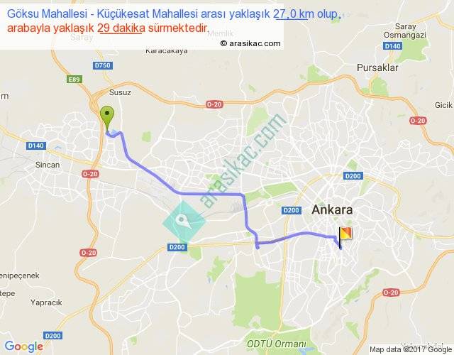 Göksu Mahallesi - Küçükesat Mahallesi arası yaklaşık olarak 90 km/h ile yukarıda belirtilen sürede olup, iki yerin kuş uçuşu uzaklığı (mesafesi) 21'dir. Yolculuk otobüsle 37 dakika sürmektedir.