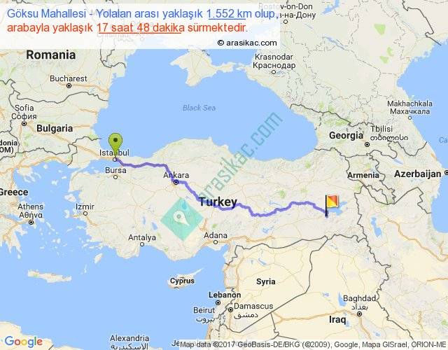 Göksu Mahallesi - Yolalan arası yaklaşık olarak 90 km/h ile yukarıda belirtilen sürede olup, iki yerin kuş uçuşu uzaklığı (mesafesi) 1167'dir. Eğer belirtilen yerler arasında uçak seferi var ise bu süre uçakla 1 saat 47 dakika'ya kadar düşebilir. Yolculuk otobüsle 23 saat 8 dakika sürmektedir.