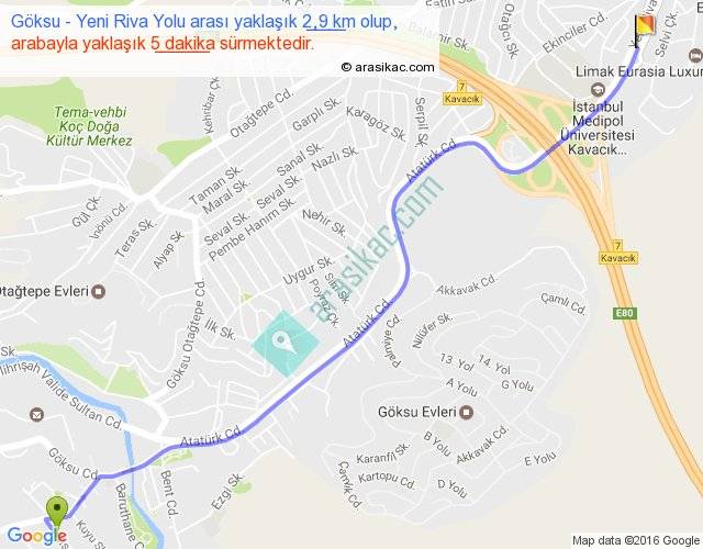 Göksu - Yeni Riva Yolu arası yaklaşık olarak 90 km/h ile yukarıda belirtilen sürede olup, iki yerin kuş uçuşu uzaklığı (mesafesi) 2'dir. Yolculuk otobüsle 6 dakika sürmektedir.
