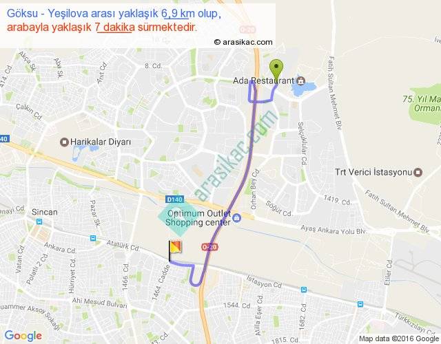 Göksu - Yeşilova arası yaklaşık olarak 90 km/h ile yukarıda belirtilen sürede olup, iki yerin kuş uçuşu uzaklığı (mesafesi) 4'dir. Yolculuk otobüsle 9 dakika sürmektedir.