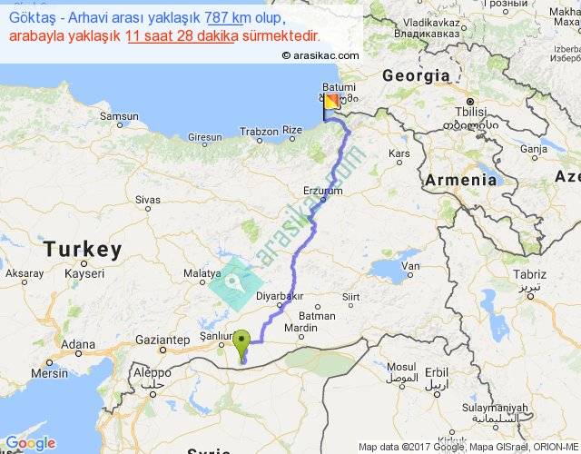 Göktaş - Arhavi arası yaklaşık olarak 90 km/h ile yukarıda belirtilen sürede olup, iki yerin kuş uçuşu uzaklığı (mesafesi) 530'dir. Eğer belirtilen yerler arasında uçak seferi var ise bu süre uçakla 48 dakika'ya kadar düşebilir. Yolculuk otobüsle 14 saat 54 dakika sürmektedir.