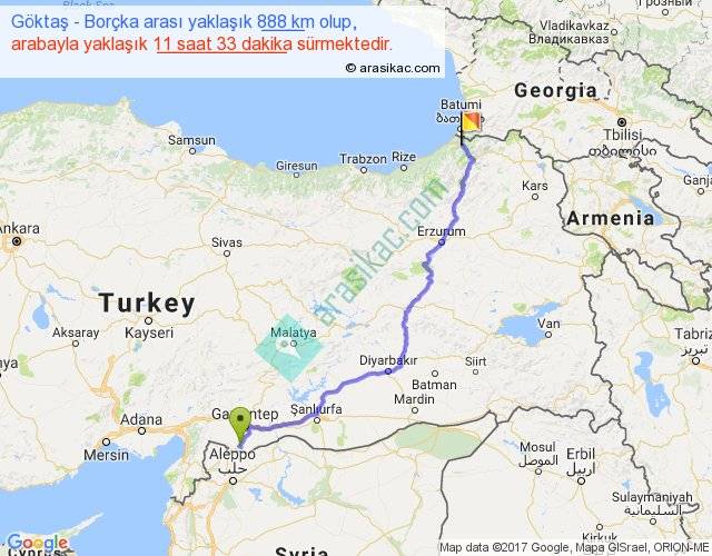 Göktaş - Borçka arası yaklaşık olarak 90 km/h ile yukarıda belirtilen sürede olup, iki yerin kuş uçuşu uzaklığı (mesafesi) 634'dir. Eğer belirtilen yerler arasında uçak seferi var ise bu süre uçakla 58 dakika'ya kadar düşebilir. Yolculuk otobüsle 15 saat 0 dakika sürmektedir.