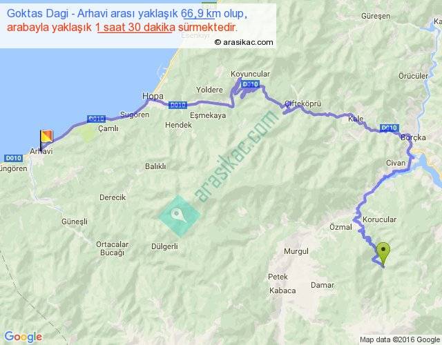 Goktas Dagi - Arhavi arası yaklaşık olarak 90 km/h ile yukarıda belirtilen sürede olup, iki yerin kuş uçuşu uzaklığı (mesafesi) 30'dir. Yolculuk otobüsle 1 saat 57 dakika sürmektedir.