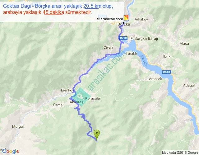 Goktas Dagi - Borçka arası yaklaşık olarak 90 km/h ile yukarıda belirtilen sürede olup, iki yerin kuş uçuşu uzaklığı (mesafesi) 11'dir. Yolculuk otobüsle 58 dakika sürmektedir.