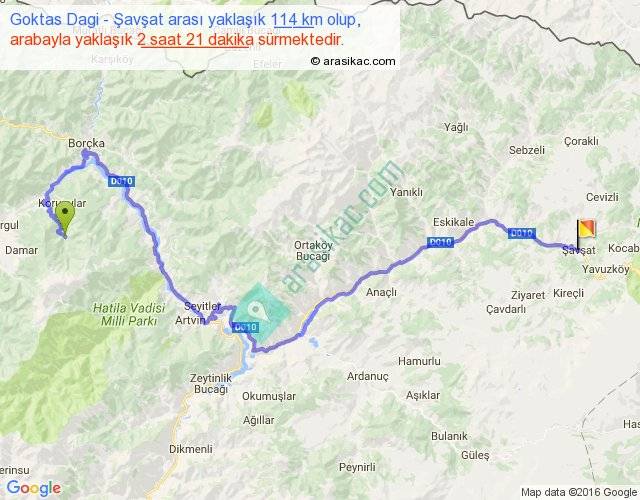 Goktas Dagi - Şavşat arası yaklaşık olarak 90 km/h ile yukarıda belirtilen sürede olup, iki yerin kuş uçuşu uzaklığı (mesafesi) 59'dir. Yolculuk otobüsle 3 saat 3 dakika sürmektedir.