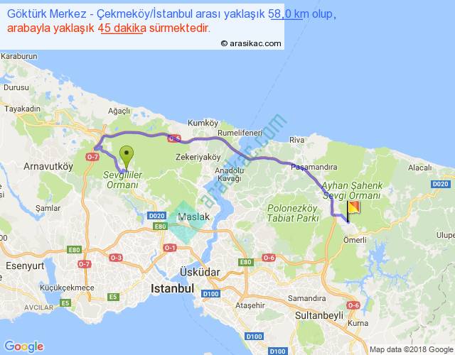 Göktürk Merkez - Çekmeköy İstanbul arası yaklaşık olarak 90 km/h ile yukarıda belirtilen sürede olup, iki yerin kuş uçuşu uzaklığı (mesafesi) 37'dir. Yolculuk otobüsle 1 saat 10 dakika sürmektedir.