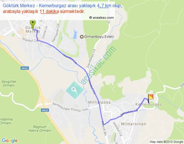 Göktürk Merkez - Kemerburgaz arası yaklaşık olarak 90 km/h ile yukarıda belirtilen sürede olup, iki yerin kuş uçuşu uzaklığı (mesafesi) 3'dir. Yolculuk otobüsle 14 dakika sürmektedir.
