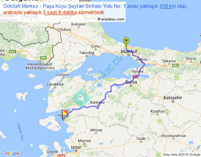 Göktürk Merkez - Paşa Koyu Şeytan Sofrası Yolu No: 1 arası yaklaşık olarak 90 km/h ile yukarıda belirtilen sürede olup, iki yerin kuş uçuşu uzaklığı (mesafesi) 282'dir. Eğer belirtilen yerler arasında uçak seferi var ise bu süre uçakla 26 dakika'ya kadar düşebilir. Yolculuk otobüsle 6 saat 40 dakika sürmektedir.