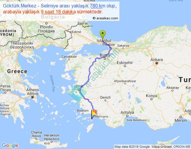 Göktürk Merkez - Selimiye arası yaklaşık olarak 90 km/h ile yukarıda belirtilen sürede olup, iki yerin kuş uçuşu uzaklığı (mesafesi) 499'dir. Eğer belirtilen yerler arasında uçak seferi var ise bu süre uçakla 46 dakika'ya kadar düşebilir. Yolculuk otobüsle 12 saat 5 dakika sürmektedir.