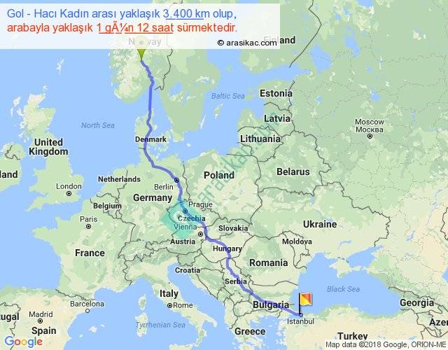 Gol - Hacı Kadın arası yaklaşık olarak 90 km/h ile yukarıda belirtilen sürede olup, iki yerin kuş uçuşu uzaklığı (mesafesi) 2562'dir. Eğer belirtilen yerler arasında uçak seferi var ise bu süre uçakla 3 saat 56 dakika'ya kadar düşebilir. Yolculuk otobüsle 1 gün 22 saat sürmektedir.
