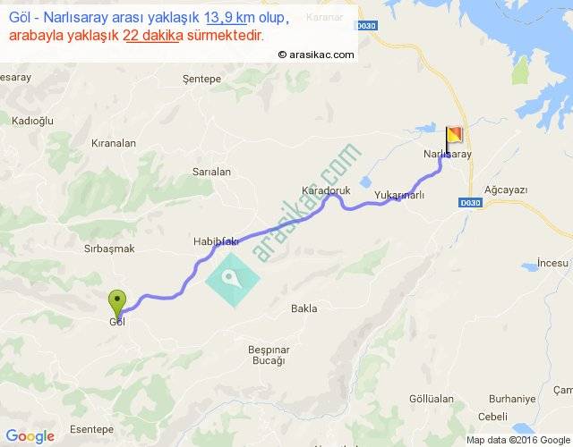 Göl - Narlısaray arası yaklaşık olarak 90 km/h ile yukarıda belirtilen sürede olup, iki yerin kuş uçuşu uzaklığı (mesafesi) 12'dir. Yolculuk otobüsle 28 dakika sürmektedir.