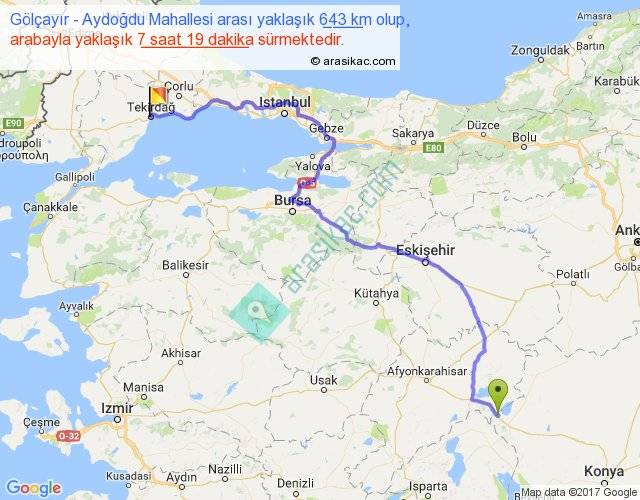 Gölçayır - Aydoğdu Mahallesi arası yaklaşık olarak 90 km/h ile yukarıda belirtilen sürede olup, iki yerin kuş uçuşu uzaklığı (mesafesi) 427'dir. Eğer belirtilen yerler arasında uçak seferi var ise bu süre uçakla 39 dakika'ya kadar düşebilir. Yolculuk otobüsle 9 saat 30 dakika sürmektedir.