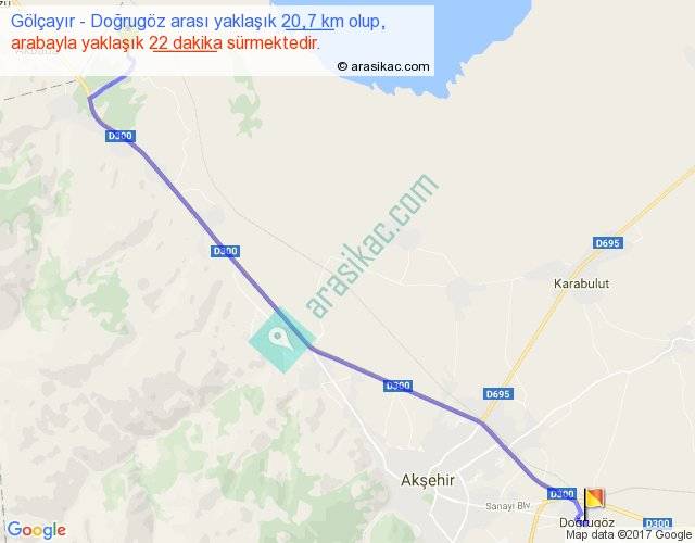 Gölçayır - Doğrugöz arası yaklaşık olarak 90 km/h ile yukarıda belirtilen sürede olup, iki yerin kuş uçuşu uzaklığı (mesafesi) 18'dir. Yolculuk otobüsle 28 dakika sürmektedir.
