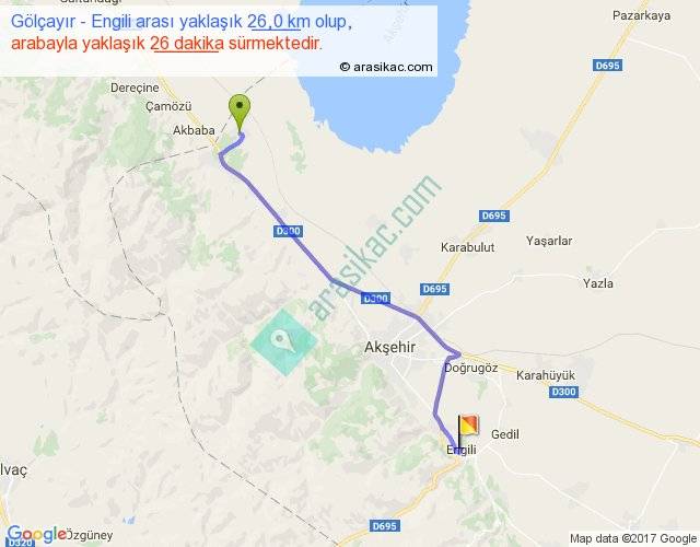 Gölçayır - Engili arası yaklaşık olarak 90 km/h ile yukarıda belirtilen sürede olup, iki yerin kuş uçuşu uzaklığı (mesafesi) 21'dir. Yolculuk otobüsle 33 dakika sürmektedir.