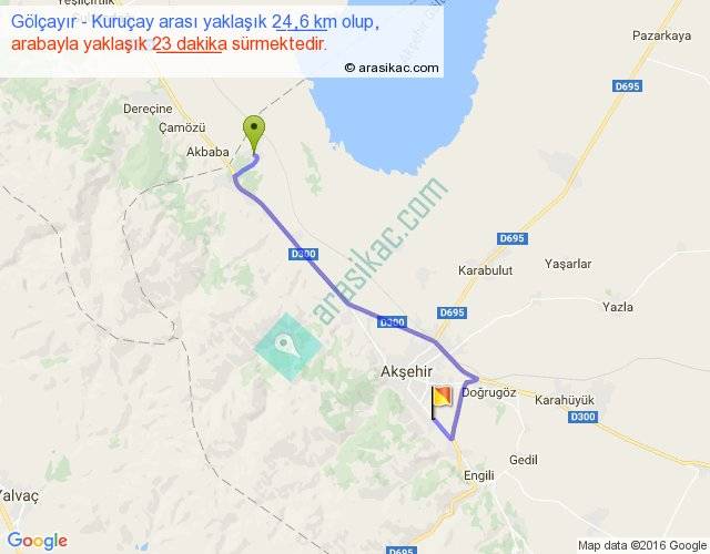 Gölçayır - Kuruçay arası yaklaşık olarak 90 km/h ile yukarıda belirtilen sürede olup, iki yerin kuş uçuşu uzaklığı (mesafesi) 17'dir. Yolculuk otobüsle 29 dakika sürmektedir.