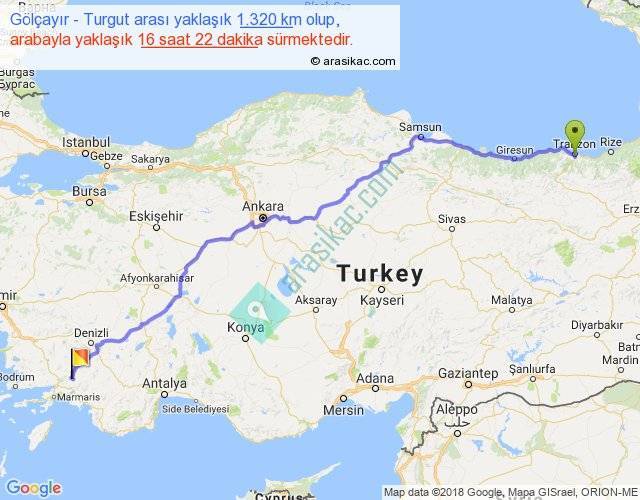 Gölçayır - Turgut arası yaklaşık olarak 90 km/h ile yukarıda belirtilen sürede olup, iki yerin kuş uçuşu uzaklığı (mesafesi) 1034'dir. Eğer belirtilen yerler arasında uçak seferi var ise bu süre uçakla 1 saat 35 dakika'ya kadar düşebilir. Yolculuk otobüsle 21 saat 16 dakika sürmektedir.