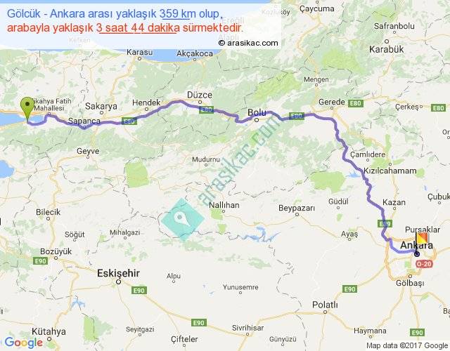 Gölcük - Ankara arası yaklaşık olarak 90 km/h ile yukarıda belirtilen sürede olup, iki yerin kuş uçuşu uzaklığı (mesafesi) 270'dir. Eğer belirtilen yerler arasında uçak seferi var ise bu süre uçakla 24 dakika'ya kadar düşebilir. Yolculuk otobüsle 4 saat 51 dakika sürmektedir.