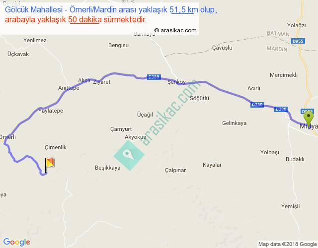 Gölcük Mahallesi - Ömerli Mardin arası yaklaşık olarak 90 km/h ile yukarıda belirtilen sürede olup, iki yerin kuş uçuşu uzaklığı (mesafesi) 32'dir. Yolculuk otobüsle 1 saat 5 dakika sürmektedir.