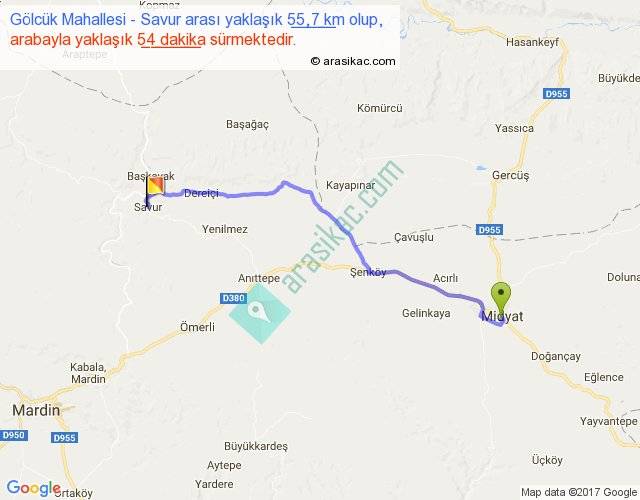 Gölcük Mahallesi - Savur arası yaklaşık olarak 90 km/h ile yukarıda belirtilen sürede olup, iki yerin kuş uçuşu uzaklığı (mesafesi) 45'dir. Yolculuk otobüsle 1 saat 10 dakika sürmektedir.