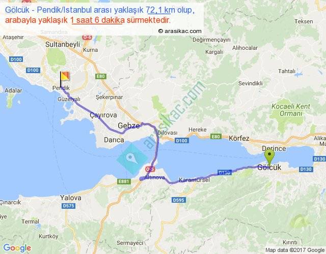 Gölcük - Pendik Istanbul arası yaklaşık olarak 90 km/h ile yukarıda belirtilen sürede olup, iki yerin kuş uçuşu uzaklığı (mesafesi) 50'dir. Yolculuk otobüsle 1 saat 25 dakika sürmektedir.