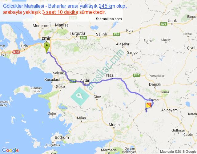 Gölcükler Mahallesi - Baharlar arası yaklaşık olarak 90 km/h ile yukarıda belirtilen sürede olup, iki yerin kuş uçuşu uzaklığı (mesafesi) 180'dir. Yolculuk otobüsle 4 saat 7 dakika sürmektedir.