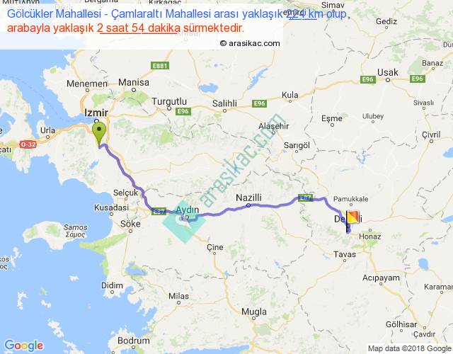 Gölcükler Mahallesi - Çamlaraltı Mahallesi arası yaklaşık olarak 90 km/h ile yukarıda belirtilen sürede olup, iki yerin kuş uçuşu uzaklığı (mesafesi) 177'dir. Yolculuk otobüsle 3 saat 46 dakika sürmektedir.