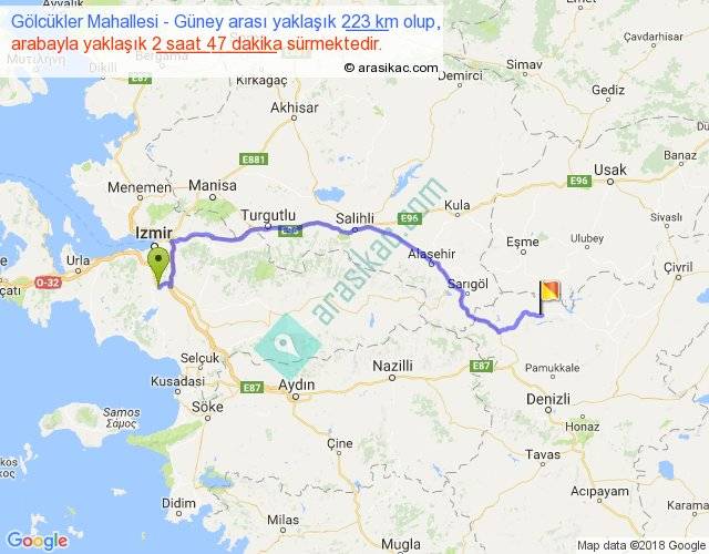 Gölcükler Mahallesi - Güney arası yaklaşık olarak 90 km/h ile yukarıda belirtilen sürede olup, iki yerin kuş uçuşu uzaklığı (mesafesi) 165'dir. Yolculuk otobüsle 3 saat 37 dakika sürmektedir.