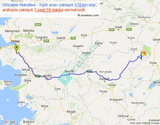 Gölcükler Mahallesi - Irgıllı arası yaklaşık olarak 90 km/h ile yukarıda belirtilen sürede olup, iki yerin kuş uçuşu uzaklığı (mesafesi) 239'dir. Yolculuk otobüsle 5 saat 10 dakika sürmektedir.