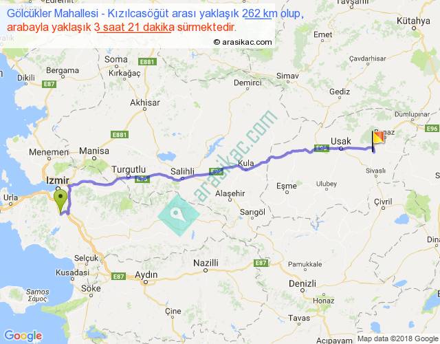 Gölcükler Mahallesi - Kızılcasöğüt arası yaklaşık olarak 90 km/h ile yukarıda belirtilen sürede olup, iki yerin kuş uçuşu uzaklığı (mesafesi) 221'dir. Yolculuk otobüsle 4 saat 21 dakika sürmektedir.