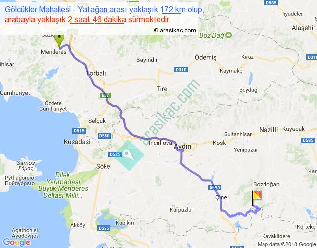 Gölcükler Mahallesi - Yatağan arası yaklaşık olarak 90 km/h ile yukarıda belirtilen sürede olup, iki yerin kuş uçuşu uzaklığı (mesafesi) 120'dir. Yolculuk otobüsle 3 saat 35 dakika sürmektedir.