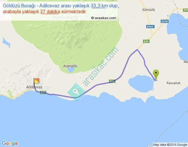 Göldüzü Bucağı - Adilcevaz arası yaklaşık olarak 90 km/h ile yukarıda belirtilen sürede olup, iki yerin kuş uçuşu uzaklığı (mesafesi) 25'dir. Yolculuk otobüsle 35 dakika sürmektedir.