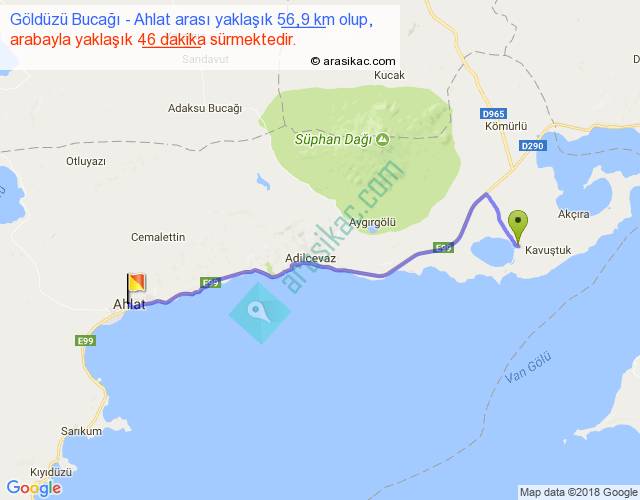 Göldüzü Bucağı - Ahlat arası yaklaşık olarak 90 km/h ile yukarıda belirtilen sürede olup, iki yerin kuş uçuşu uzaklığı (mesafesi) 47'dir. Yolculuk otobüsle 59 dakika sürmektedir.