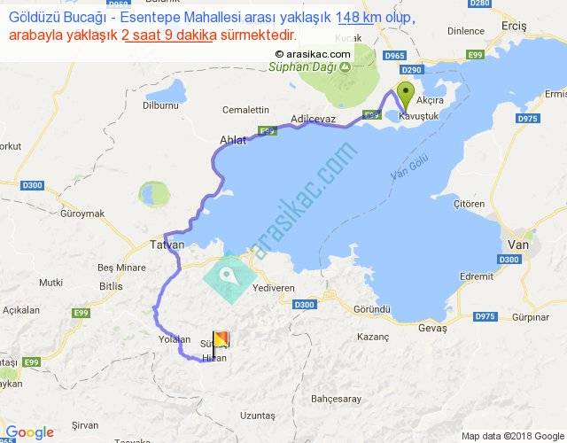 Göldüzü Bucağı - Esentepe Mahallesi arası yaklaşık olarak 90 km/h ile yukarıda belirtilen sürede olup, iki yerin kuş uçuşu uzaklığı (mesafesi) 83'dir. Yolculuk otobüsle 2 saat 47 dakika sürmektedir.
