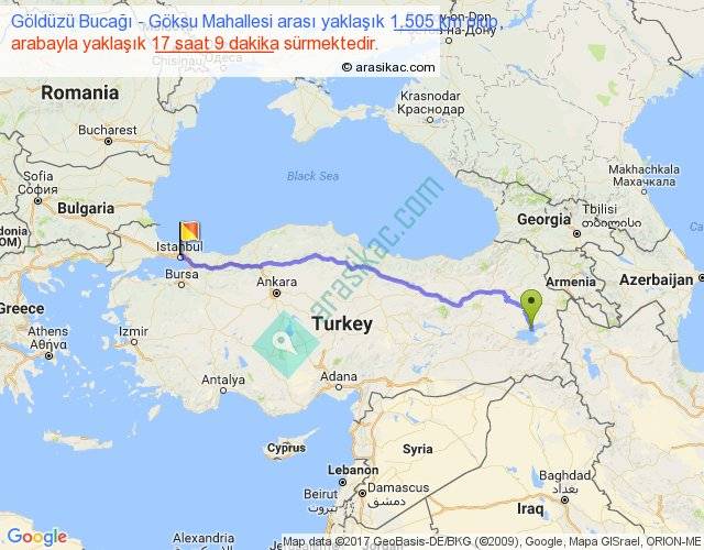 Göldüzü Bucağı - Göksu Mahallesi arası yaklaşık olarak 90 km/h ile yukarıda belirtilen sürede olup, iki yerin kuş uçuşu uzaklığı (mesafesi) 1207'dir. Eğer belirtilen yerler arasında uçak seferi var ise bu süre uçakla 1 saat 51 dakika'ya kadar düşebilir. Yolculuk otobüsle 22 saat 17 dakika sürmektedir.