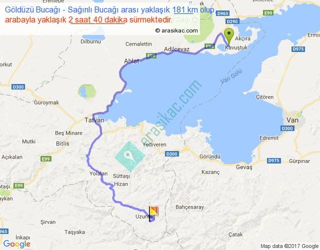Göldüzü Bucağı - Sağınlı Bucağı arası yaklaşık olarak 90 km/h ile yukarıda belirtilen sürede olup, iki yerin kuş uçuşu uzaklığı (mesafesi) 91'dir. Yolculuk otobüsle 3 saat 28 dakika sürmektedir.