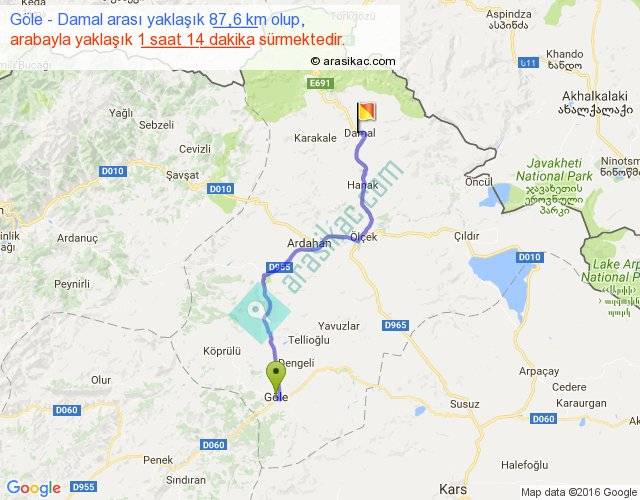 Göle - Damal arası yaklaşık olarak 90 km/h ile yukarıda belirtilen sürede olup, iki yerin kuş uçuşu uzaklığı (mesafesi) 63'dir. Yolculuk otobüsle 1 saat 36 dakika sürmektedir.