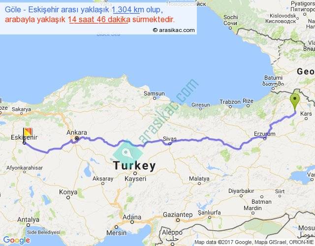 Göle - Eskişehir arası yaklaşık olarak 90 km/h ile yukarıda belirtilen sürede olup, iki yerin kuş uçuşu uzaklığı (mesafesi) 1025'dir. Eğer belirtilen yerler arasında uçak seferi var ise bu süre uçakla 1 saat 34 dakika'ya kadar düşebilir. Yolculuk otobüsle 19 saat 11 dakika sürmektedir.