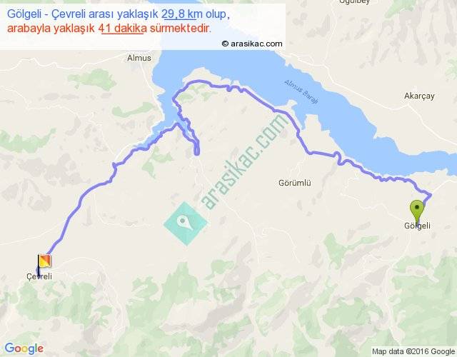 Gölgeli - Çevreli arası yaklaşık olarak 90 km/h ile yukarıda belirtilen sürede olup, iki yerin kuş uçuşu uzaklığı (mesafesi) 15'dir. Yolculuk otobüsle 53 dakika sürmektedir.