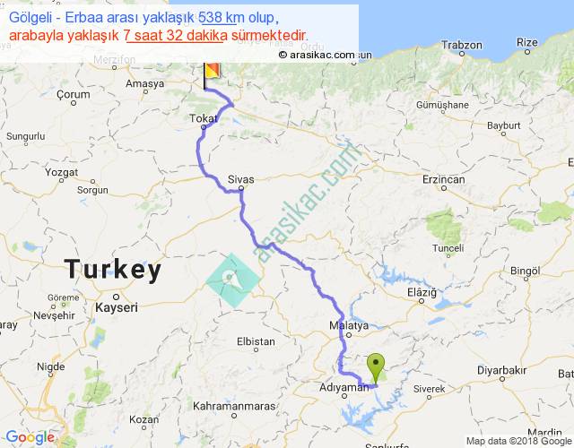 Gölgeli - Erbaa arası yaklaşık olarak 90 km/h ile yukarıda belirtilen sürede olup, iki yerin kuş uçuşu uzaklığı (mesafesi) 358'dir. Eğer belirtilen yerler arasında uçak seferi var ise bu süre uçakla 33 dakika'ya kadar düşebilir. Yolculuk otobüsle 9 saat 47 dakika sürmektedir.
