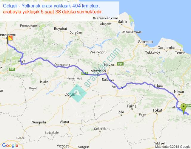 Gölgeli - Yolkonak arası yaklaşık olarak 90 km/h ile yukarıda belirtilen sürede olup, iki yerin kuş uçuşu uzaklığı (mesafesi) 291'dir. Eğer belirtilen yerler arasında uçak seferi var ise bu süre uçakla 26 dakika'ya kadar düşebilir. Yolculuk otobüsle 7 saat 19 dakika sürmektedir.
