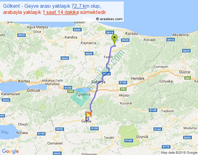 Gölkent - Geyve arası yaklaşık olarak 90 km/h ile yukarıda belirtilen sürede olup, iki yerin kuş uçuşu uzaklığı (mesafesi) 60'dir. Yolculuk otobüsle 1 saat 36 dakika sürmektedir.