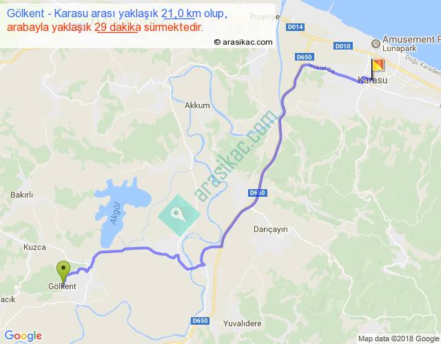 Gölkent - Karasu arası yaklaşık olarak 90 km/h ile yukarıda belirtilen sürede olup, iki yerin kuş uçuşu uzaklığı (mesafesi) 15'dir. Yolculuk otobüsle 37 dakika sürmektedir.