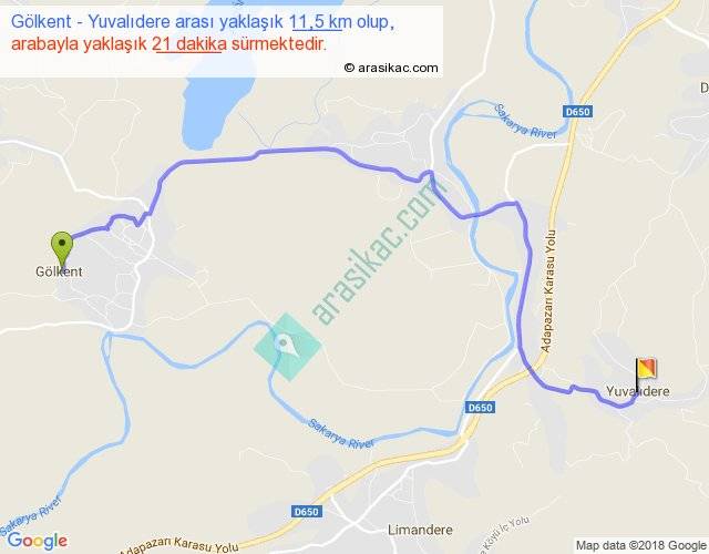 Gölkent - Yuvalıdere arası yaklaşık olarak 90 km/h ile yukarıda belirtilen sürede olup, iki yerin kuş uçuşu uzaklığı (mesafesi) 8'dir. Yolculuk otobüsle 27 dakika sürmektedir.