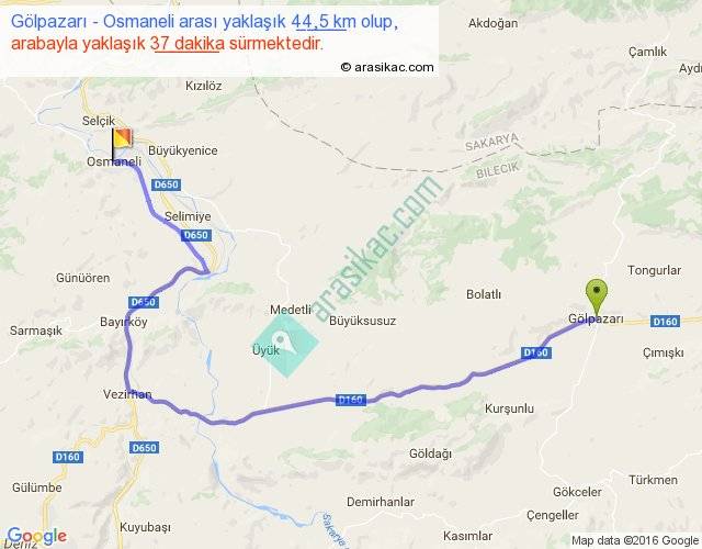 Gölpazarı - Osmaneli arası yaklaşık olarak 90 km/h ile yukarıda belirtilen sürede olup, iki yerin kuş uçuşu uzaklığı (mesafesi) 27'dir. Yolculuk otobüsle 48 dakika sürmektedir.