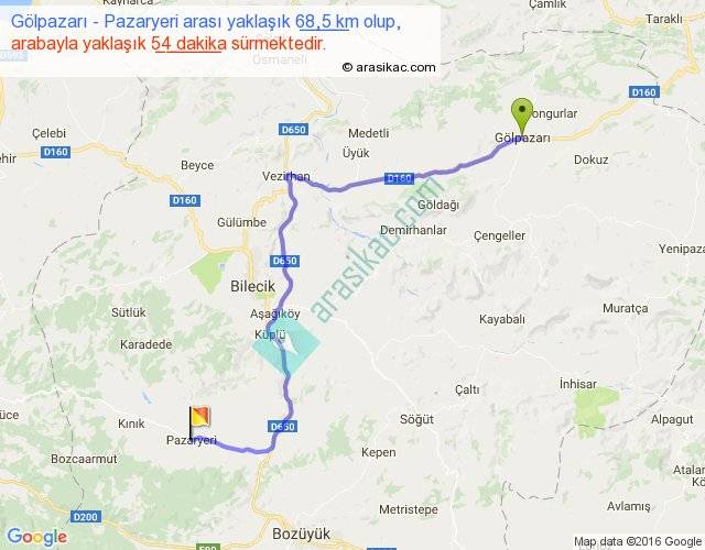 Gölpazarı - Pazaryeri arası yaklaşık olarak 90 km/h ile yukarıda belirtilen sürede olup, iki yerin kuş uçuşu uzaklığı (mesafesi) 47'dir. Yolculuk otobüsle 1 saat 10 dakika sürmektedir.