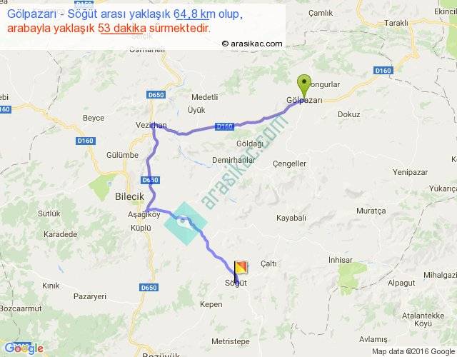 Gölpazarı - Söğüt arası yaklaşık olarak 90 km/h ile yukarıda belirtilen sürede olup, iki yerin kuş uçuşu uzaklığı (mesafesi) 32'dir. Yolculuk otobüsle 1 saat 8 dakika sürmektedir.