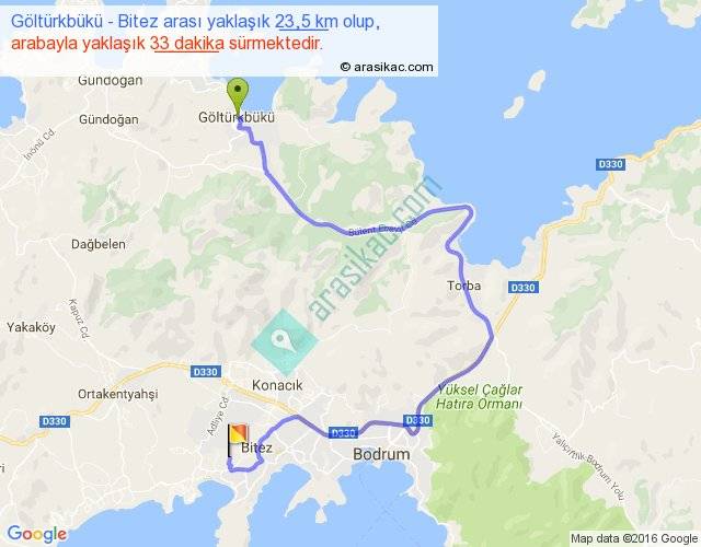 Göltürkbükü - Bitez arası yaklaşık olarak 90 km/h ile yukarıda belirtilen sürede olup, iki yerin kuş uçuşu uzaklığı (mesafesi) 9'dir. Yolculuk otobüsle 42 dakika sürmektedir.